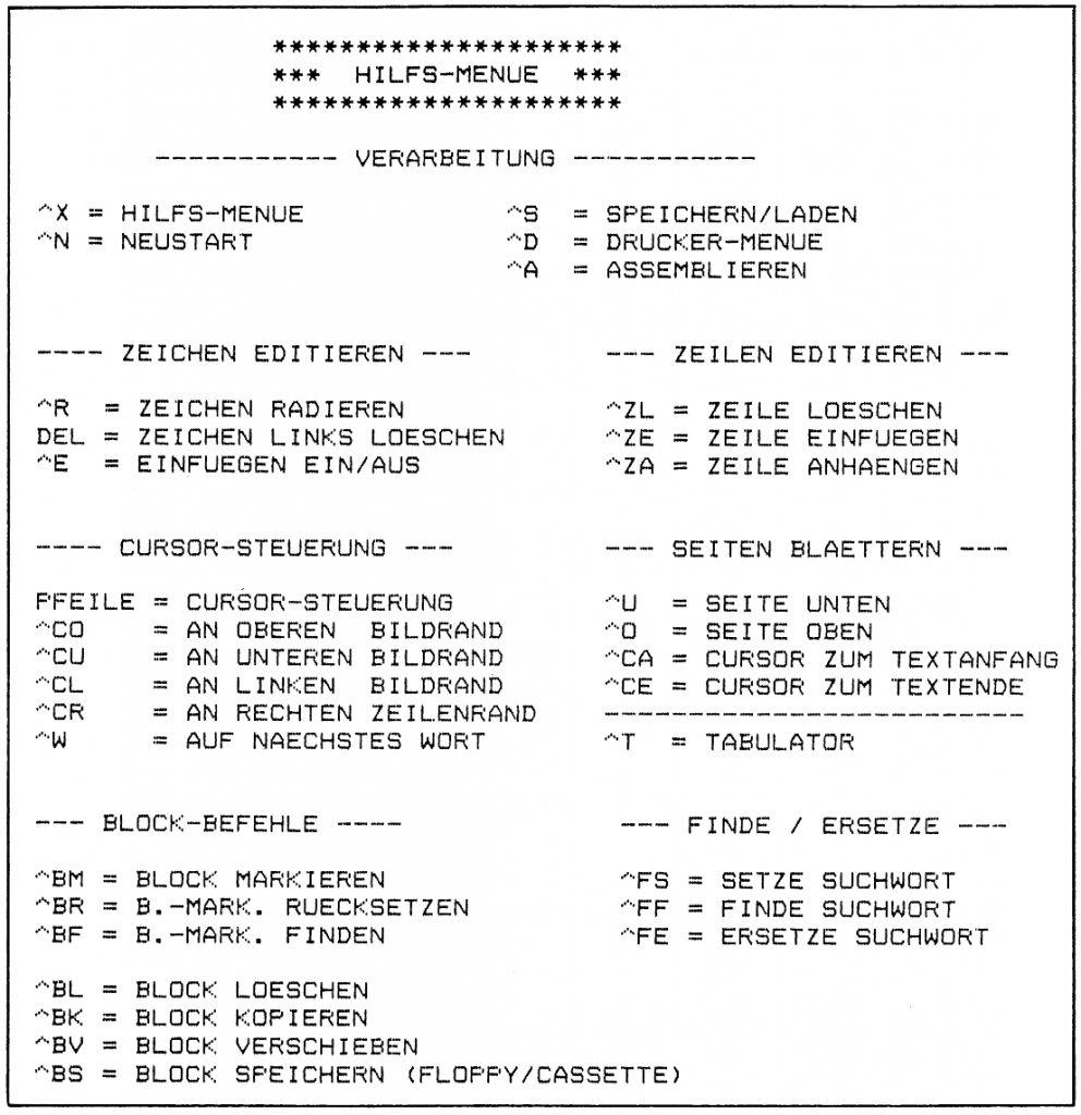 Aufgrund dieser Kennzeichnung findet das EDITOR-Programm das Hilfs-Menue an jeder beliebigen Stelle des Arbeitsspeichers. Bei einem Aufruf des Hilfs-Menues vom EDITOR aus wird nach dem Auffinden der Kenn-Bytes der ab der nachfolgenden Adresse gespeicherte Text auf dem Bildschirm dargestellt.