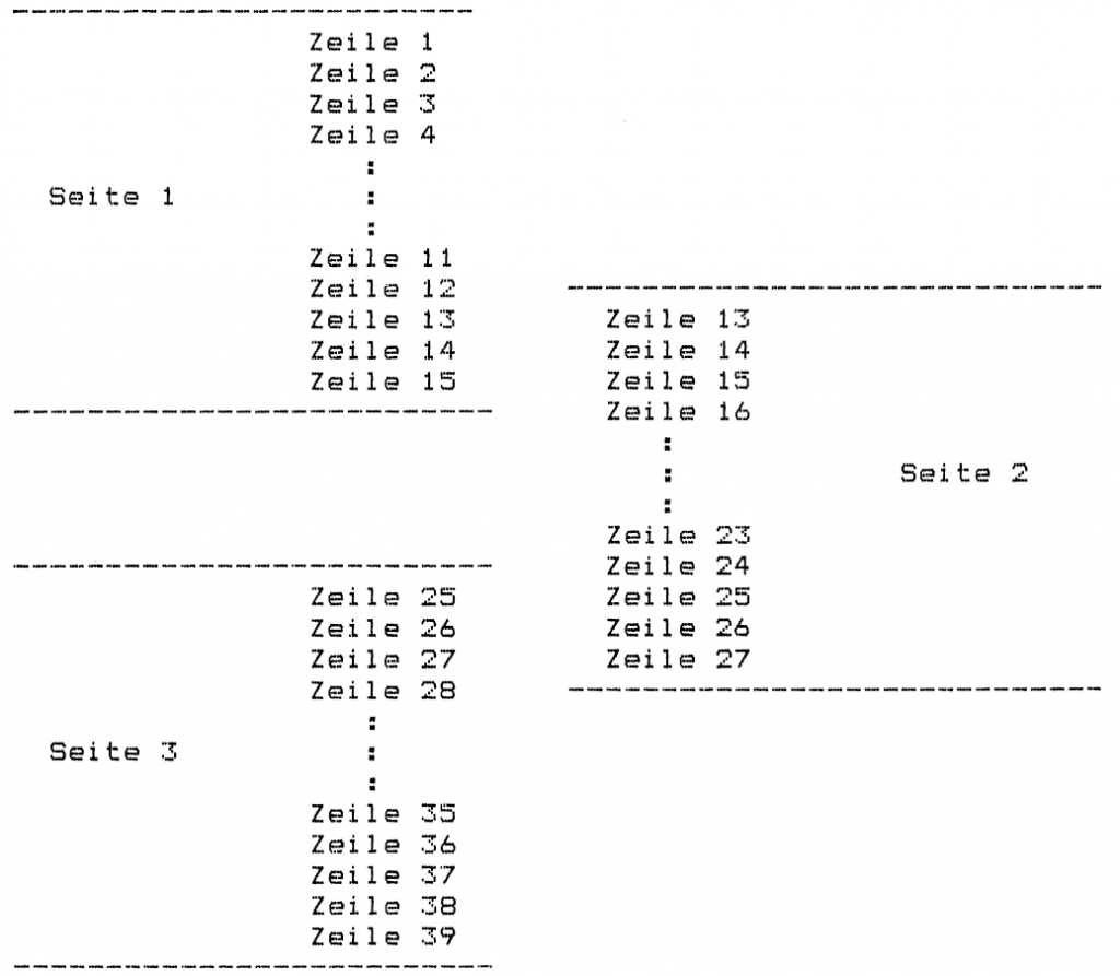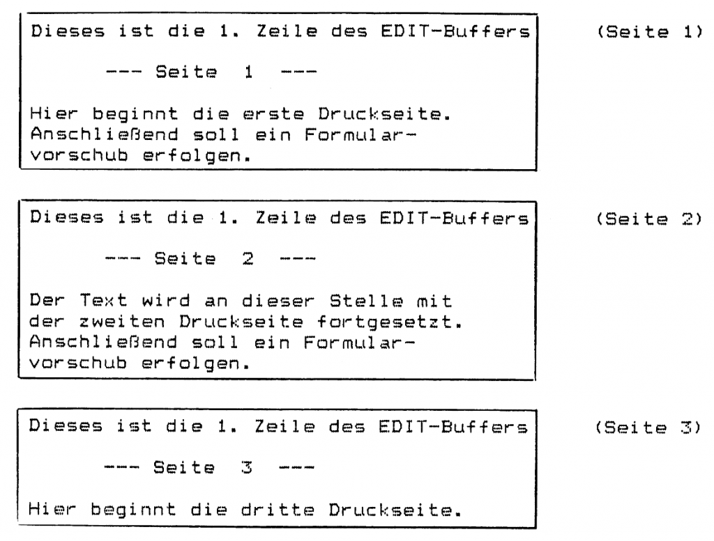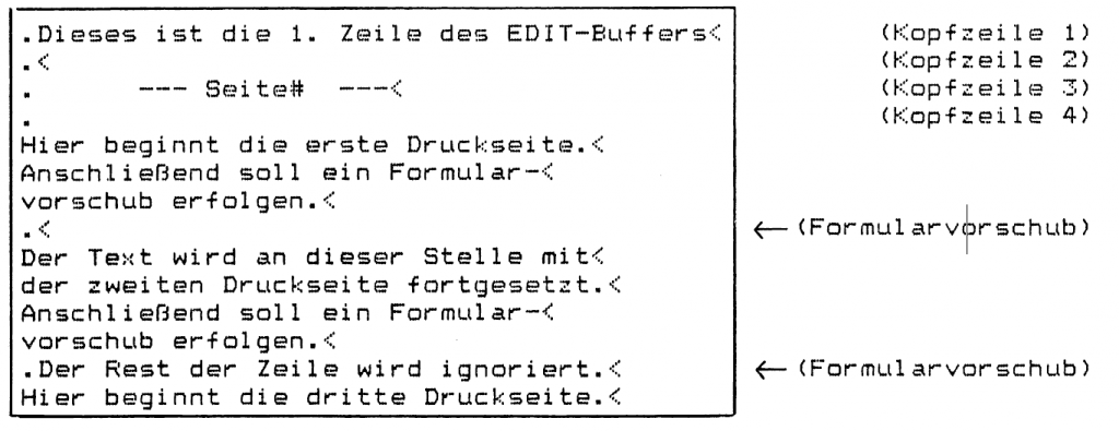 Für die Steuerung des Formularvorschubs (maximale Zeilenzahl und/oder „Punktzeilen“), sowie für das Ausdrucken von Kopfzeilen („Punktzeilen“ am Anfang des Assembler-Textes) gelten dieselben Regeln wie für das einfache Ausdrucken eines Textes ohne gleichzeitiges Assemblieren. Die verwendeten „Punktzeilen“ werden beim Assemblieren unterdrückt, sie dienen nur zur Drucker-Steuerung. Die Einstellung von Zeilenrand und maximaler Zeilenzahl pro Druck-Seite, sowie die Wahl der Seiten-Nummerierung erfolgt mit Hilfe des „Drucker-Menues“ (CTRL-D) mit anschließendem EDITOR-Rücksprung.