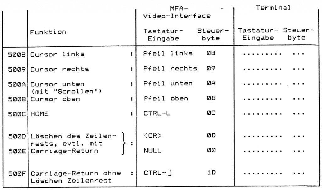 Das MFA-Video-Interface benötigt zur Ausführung des Steuerbefehls „HOME“ (Bildschirm löschen, Cursor an linken oberen Bildrand) eine Zeit von ca. 0,21 s. Aus diesem Grund muss nach der Ausgabe des „HOME“-Befehls eine entsprechende Zeitverzögerung gewährleistet werden, bevor das nächste Zeichen ausgegeben wird. Diese Zeitverzögerung, die bei anderen Terminals unter Umständen nicht notwendig ist, lässt sich ebenfalls mit Hilfe der Tabelle 1 ändern.