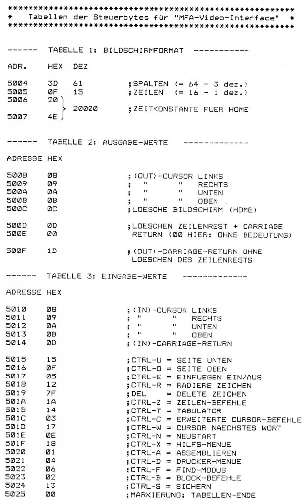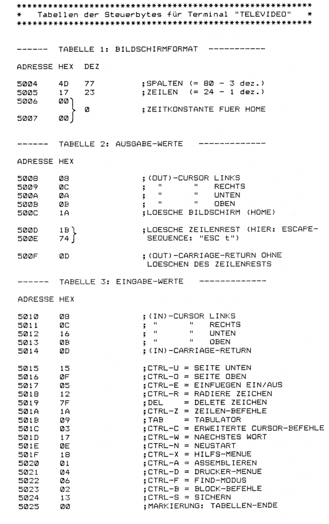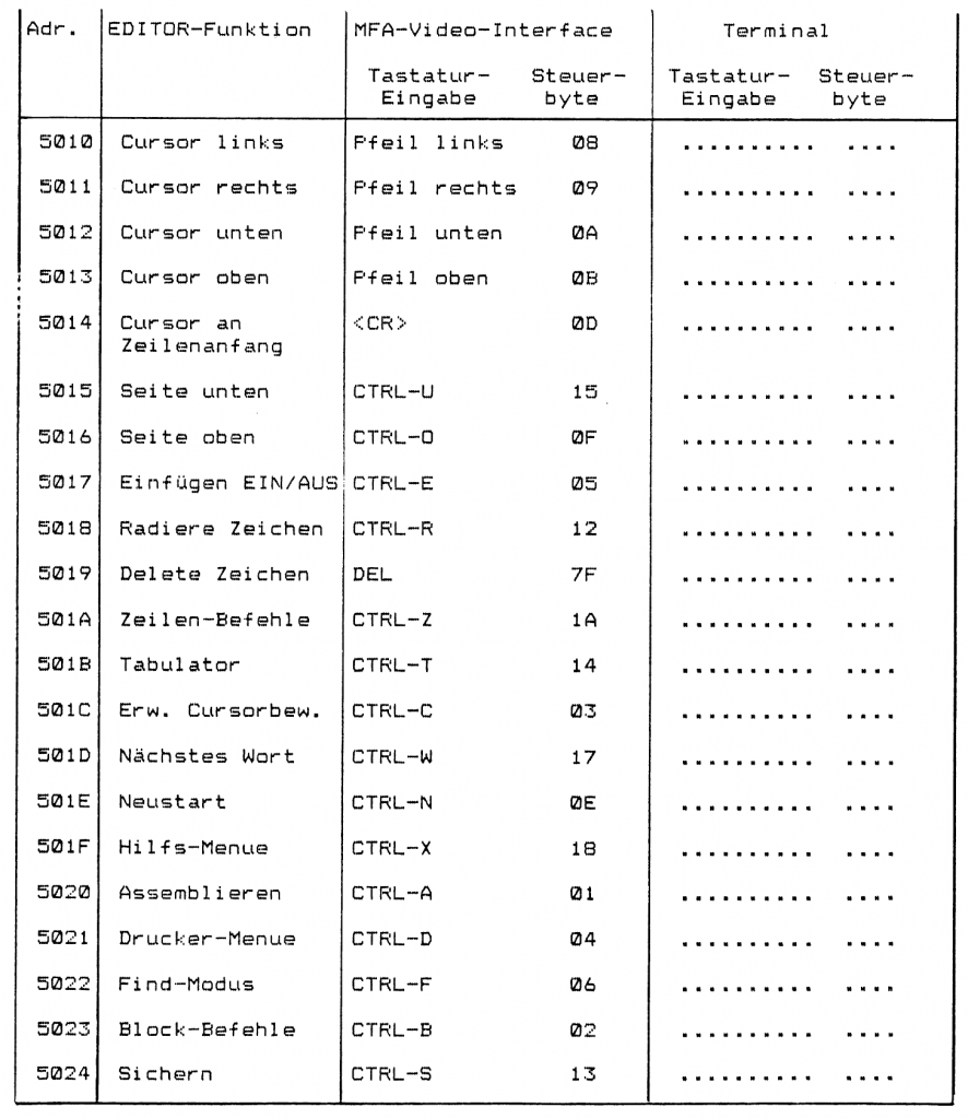 Zur einfachen Anpassbarkeit sind innerhalb des EDITOR-Programms Tabellen angelegt, mit deren Hilfe sich die Terminal-spezifischen Parameter verändern lassen. Auf der folgenden Seite sind die Anpassungs-Tabellen für das MFA-Video-Interface dargestellt. Im Anschluss daran finden sich als Beispiel für ein anderes Terminal die Anpassungs-Tabellen für das Terminal „TELEVIDEO“. Um die Terminalspezifischen Parameter zu verändern, muss das BFZ-EDITOR-Programm in einen freien RAM-Bereich des Arbeitsspeichers kopiert werden. Mit Hilfe des „MEMORY“-Kommandos des Betriebssystems lassen sich die entsprechenden Parameter des verwendeten Terminals in die zugehörigen Tabellenplätze einsetzen. Anschließend kann das EDITOR-Programm mit den veränderten Tabellenwerten in ein neues EPRQM programmiert werden. Die Ermittlung der Terminalspezifischen Parameter wird im folgenden erläutert.