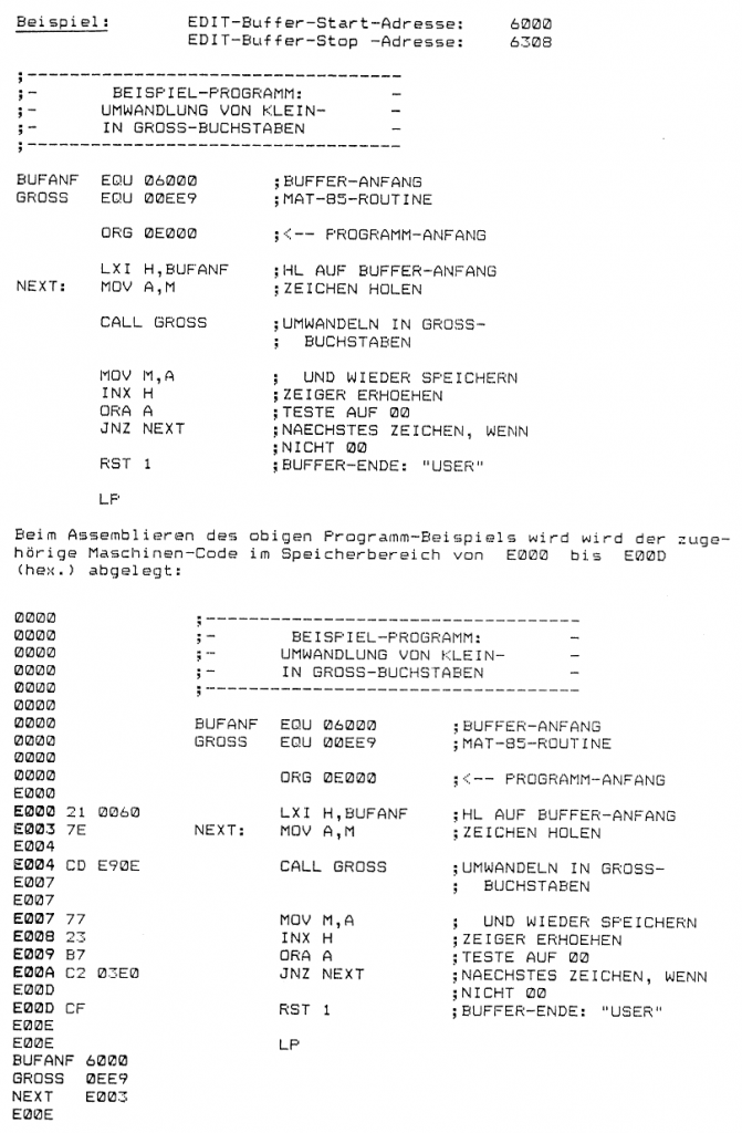 Aus diesem Grund eignet sich der BFZ-EDITOR besonders dazu, Assembler-Quell-Programme komfortabel zu erstellen, zu bearbeiten und anschließend durch den Assemblier-Vorgang in Maschinensprache umzusetzen (8085-Assembler-Code).