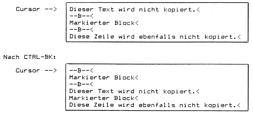 Als Tastatureingaben können unter Umständen auch „CTRL“-Eingaben oder auch „ESC-Sequenzen“ in Frage kommen (z.B. CTRL-L für „HOME“ oder „ESC t“ (= 1B 74 hex.) für „Löschen des Zeilenrests“). Bei der Ermittlung der erforder1ichen Tastatureingabe für die Cursor-Bewegung nach unten ist zu beachten, dass diese Eingabe zu einem „Scrollen“ des Bildschirminhalts nach oben führt, wenn sich der Cursor in der untersten Bildschirmzeile befindet.