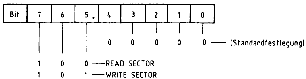 Die folgende Tabelle zeigt den Aufbau der Kommando-Wörter für WRITE SECTOR und READ SECTOR. Die Bits 0 bis 4 müssen für die vorgesehene Anwendung des FDC-Bausteins nicht verändert werden. Deshalb wird hier auf eine nähere Erläuterung verzichtet und auf das Datenblatt des FDC-Bausteins verwiesen.